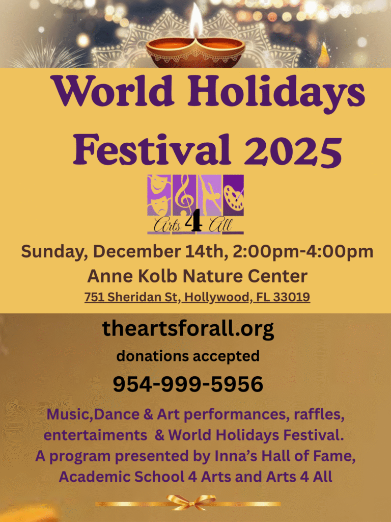 Hollywood, FL — December 14, 2025: Inna’s Hall of Fame Performing Arts Conservatory, in partnership with the Academic School for Arts, proudly presents “World Holidays,” a festive, two-hour musical showcase celebrating cultures and traditions from around the world through the universal language of music. Hosted at the scenic Ann Kolb Nature Center in Hollywood, Florida, this joyful afternoon event will feature a vibrant mix of performances highlighting the incredible talent of the Academic School for Arts students. Audiences can look forward to inspiring presentations from strings, piano, voice, and rock ’n’ roll—each capturing the spirit of world holiday traditions. “World Holidays is about unity, joy, and artistic expression,” says Miss Inna, Founder and Artistic Director of Inna’s Hall of Fame. “Our students are excited to share a program that celebrates how every culture brings light and music to the season.”